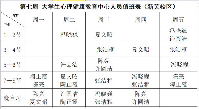 第七周 大学生心理健康教育中心人员值班表(新芜校区)